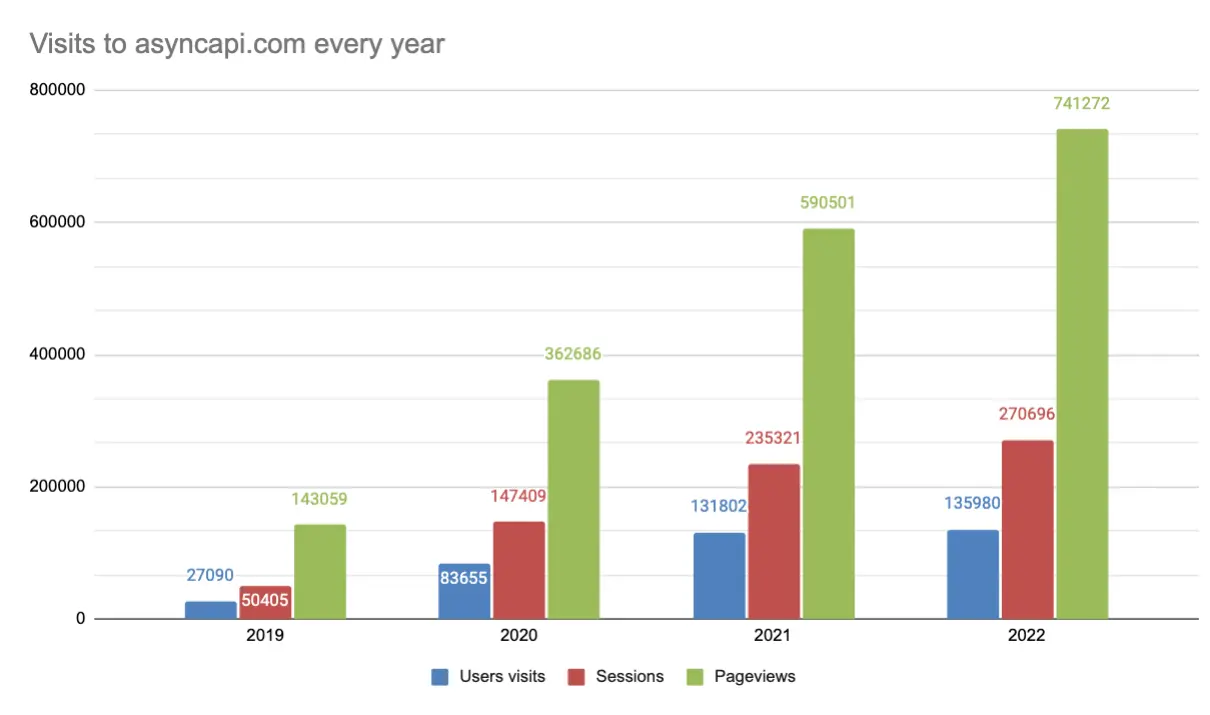 We use Google Analytics on AsyncAPI website to understand the most valuable content for you and learn how the interest is growing. The data we get doesn't 100% reflect reality because AsyncAPI is for technical people, and many technical people use plugins in browsers to block Google Analytics or browsers that block it natively.