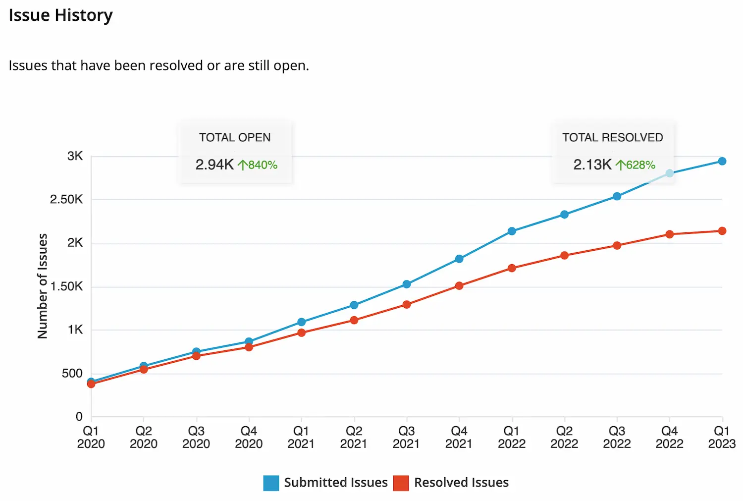 Unfortunately, the number of maintainers does not grow as much as the number of contributors. This means that the difference between the number of submitted and resolved issues will get larger and larger.