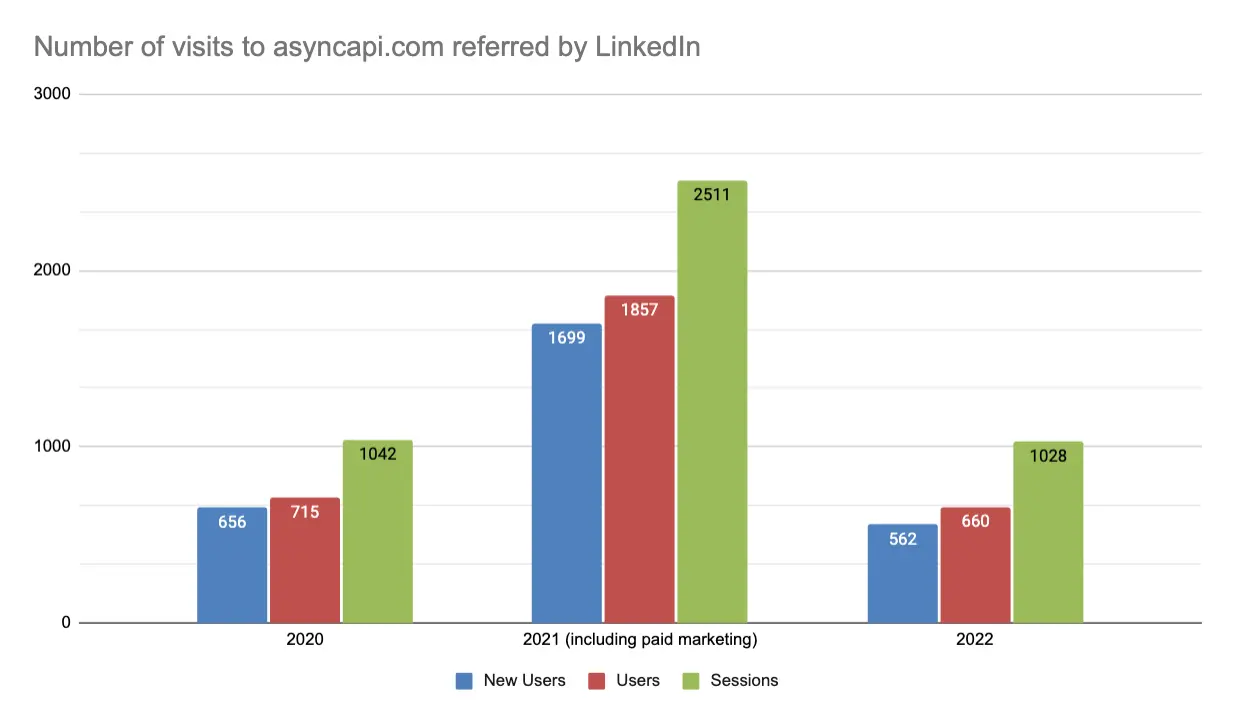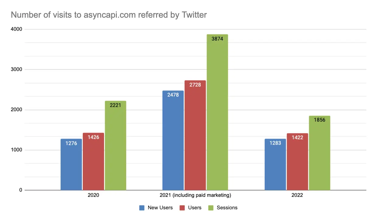 There is a much larger increase in the amount of Pageviews and Sessions but no significant increase in User visits. My theory: In 2022, we didn't have a single super viral blog post like in previous years that would bring a few thousand people in just a few days (like September 9, 2021 - over 5k readers), people that are interested in an article, and not AsyncAPI in general.