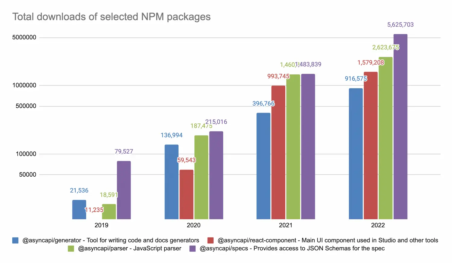 An interesting observation is that in 2021 AsyncAPI Parser was the only user of the AsyncAPI spec JSON schemas project (@asyncapi/specs), as the number of downloads was almost the same. In 2022, the AsyncAPI spec JSON schemas project was downloaded five million times, three times more than the parser. This means many more tools are dependent on the project.
