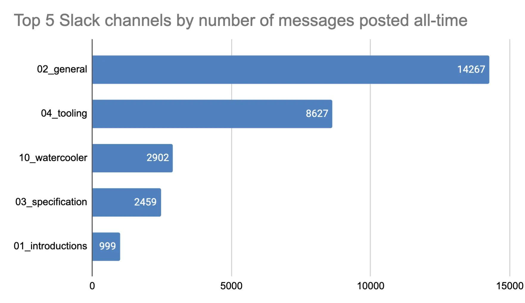 Below you can see all-time data that show the number of messages posted on each channel in Slack.