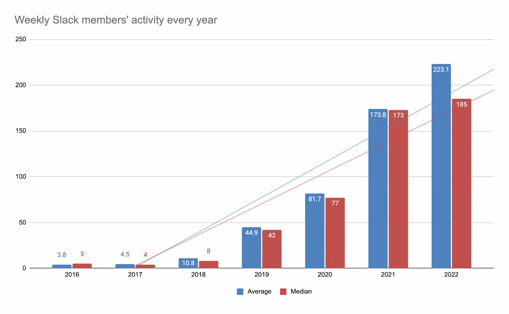 Last year was the first time the median value was much lower than the average. It is higher than the previous year, but not something we got used to so far. We noticed a significant increase in Slack members, but I think we can say that this number doesn't correlate well with median activity.