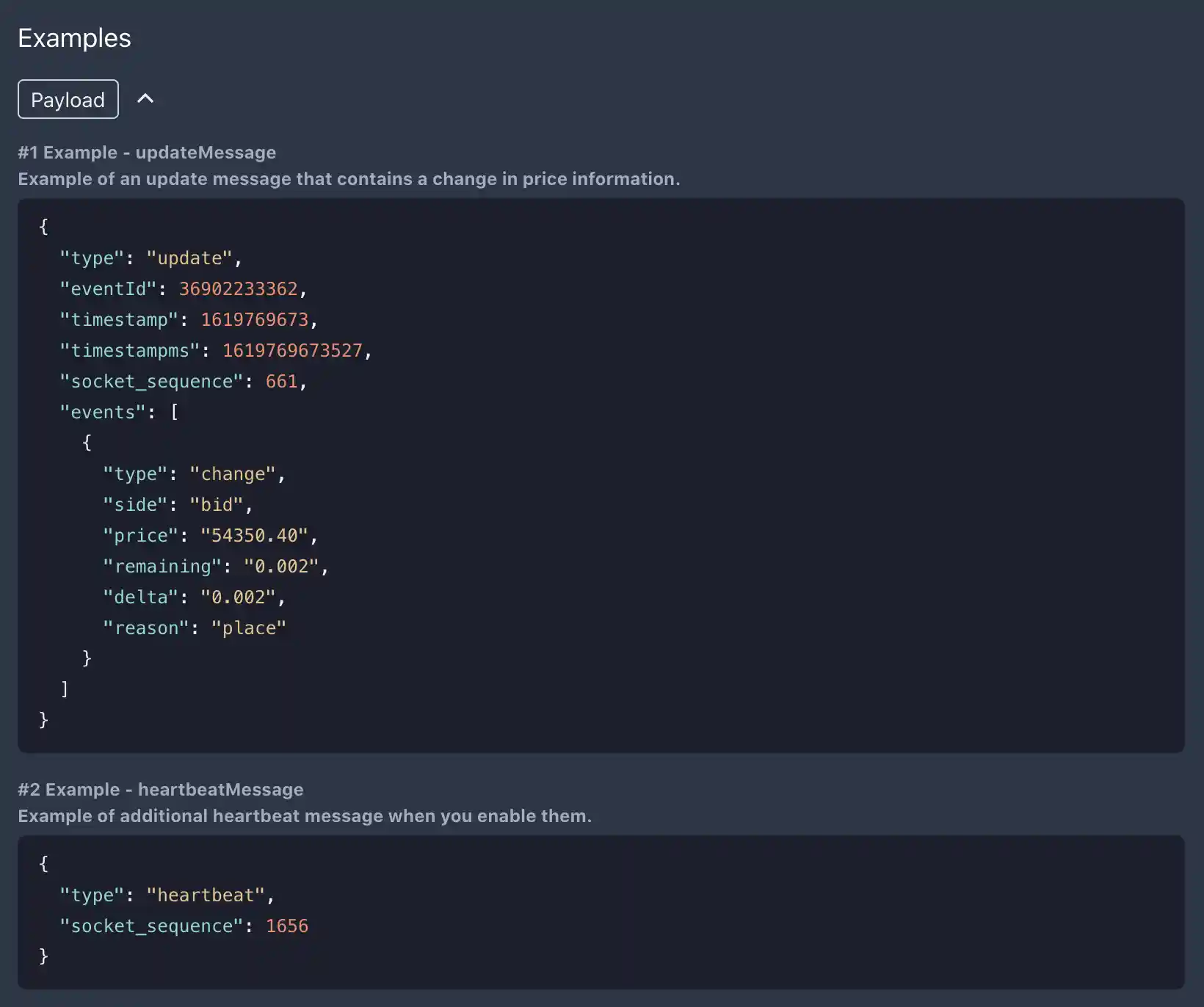 1 2 3 4 5 6 7 8 9 10 11 12 13 14 15 16 17 18 19 20 21 22 23 24 25 26 27 28 29components: messages: marketData: summary: Message with marked data information. description: | The initial response message will show the existing state of the order book. Subsequent messages will show all executed trades, as well as all other changes to the order book from orders placed or canceled. payload: $ref: '#/components/schemas/market' examples: - name: updateMessage summary: Example of an update message that contains a change in price information. payload: type: update eventId: 36902233362 timestamp: 1619769673 timestampms: 1619769673527 socket_sequence: 661 events: - type: change side: bid price: '54350.40' remaining: '0.002' delta: '0.002' reason: place - name: heartbeatMessage summary: Example of additional heartbeat message when you enable them. payload: type: heartbeat socket_sequence: 1656